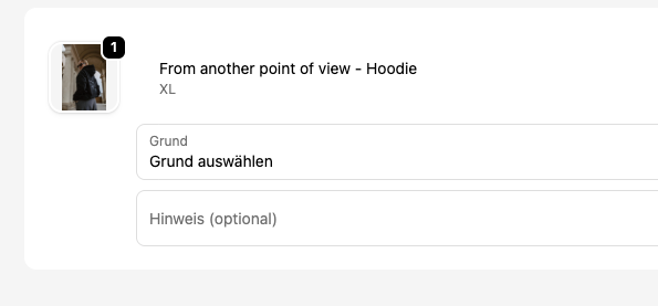 Wähle den jeweiligen Artikel aus, teile uns gerne einen Grund für die Retorure mit und klicke anschließend "Reoure anfragen"